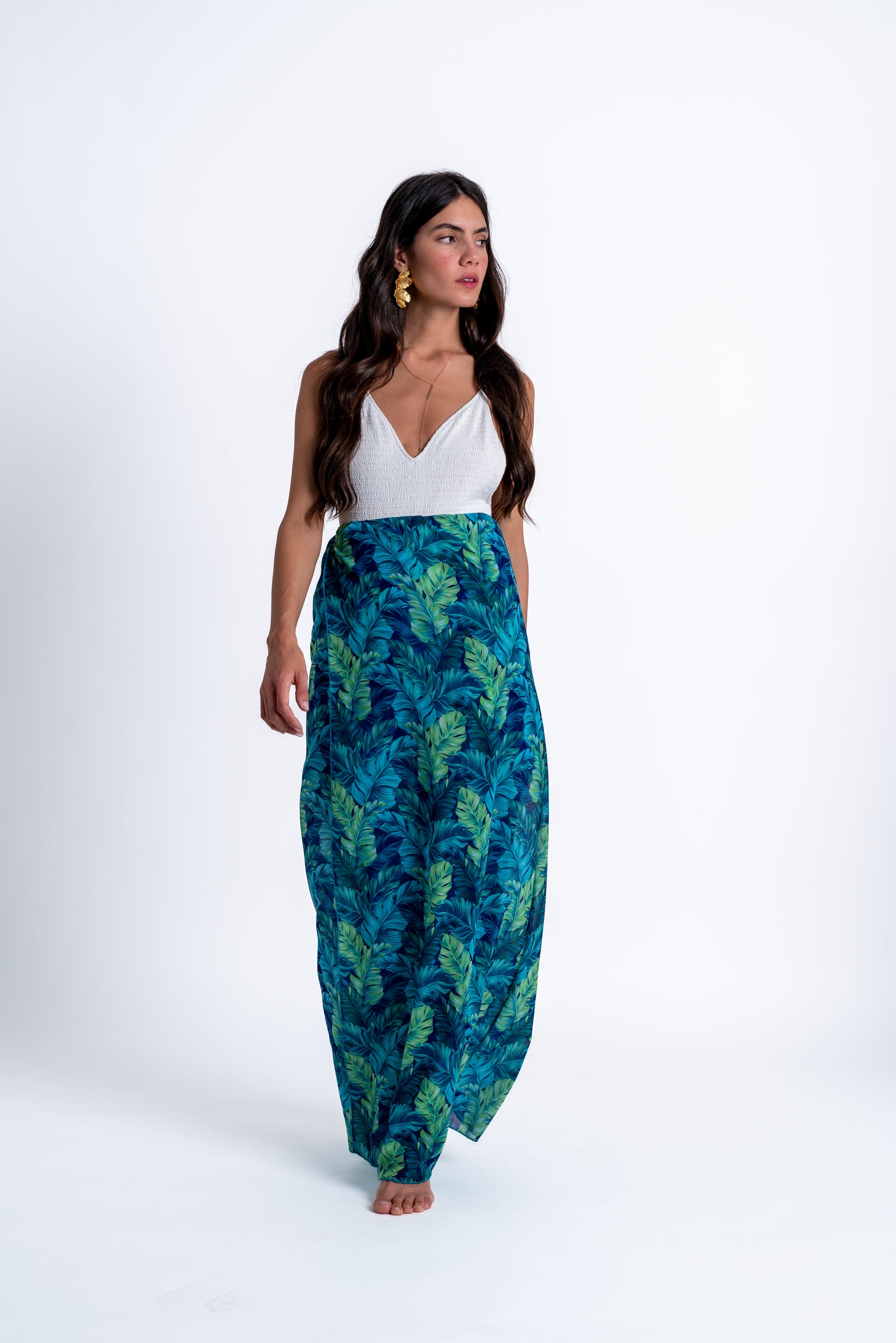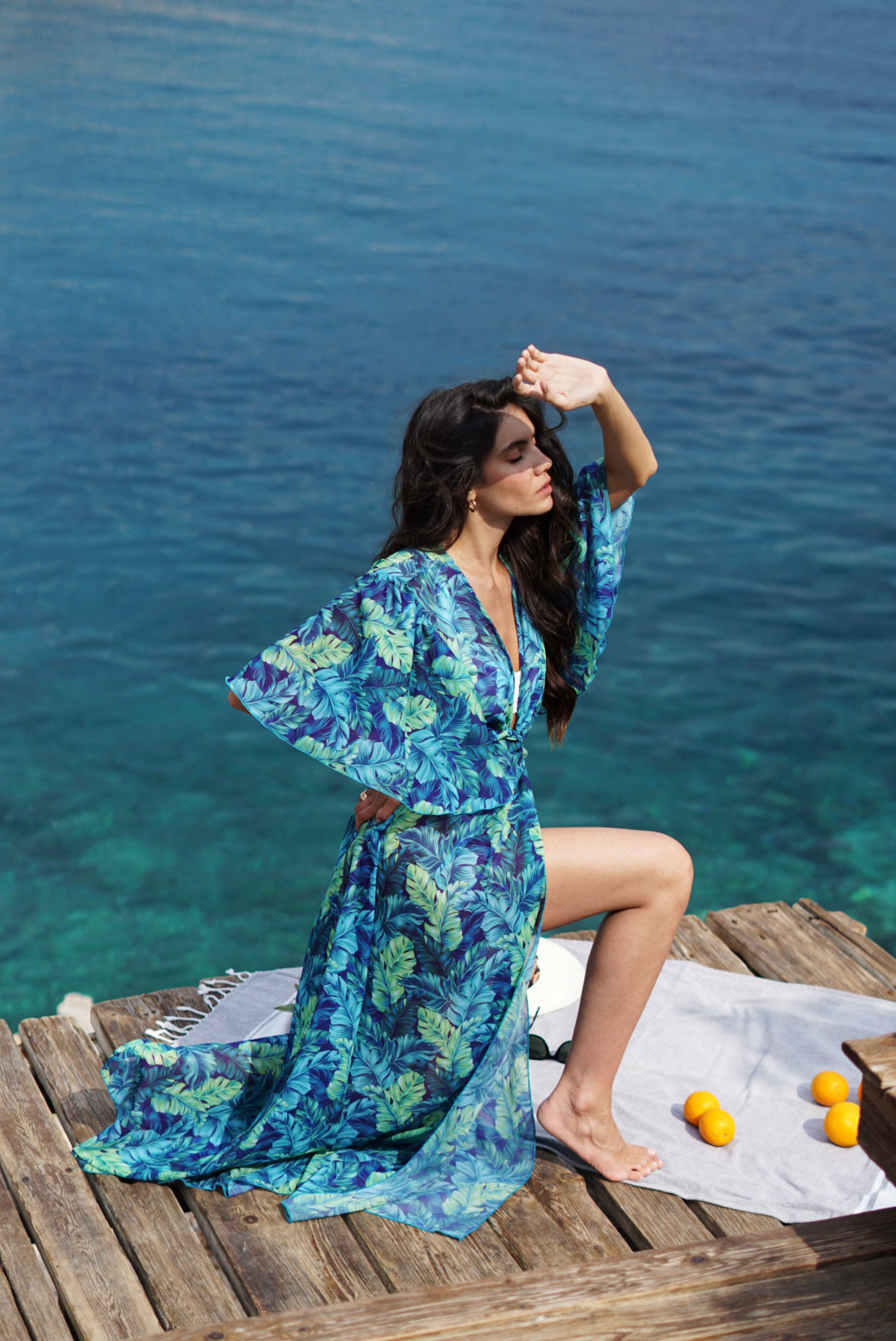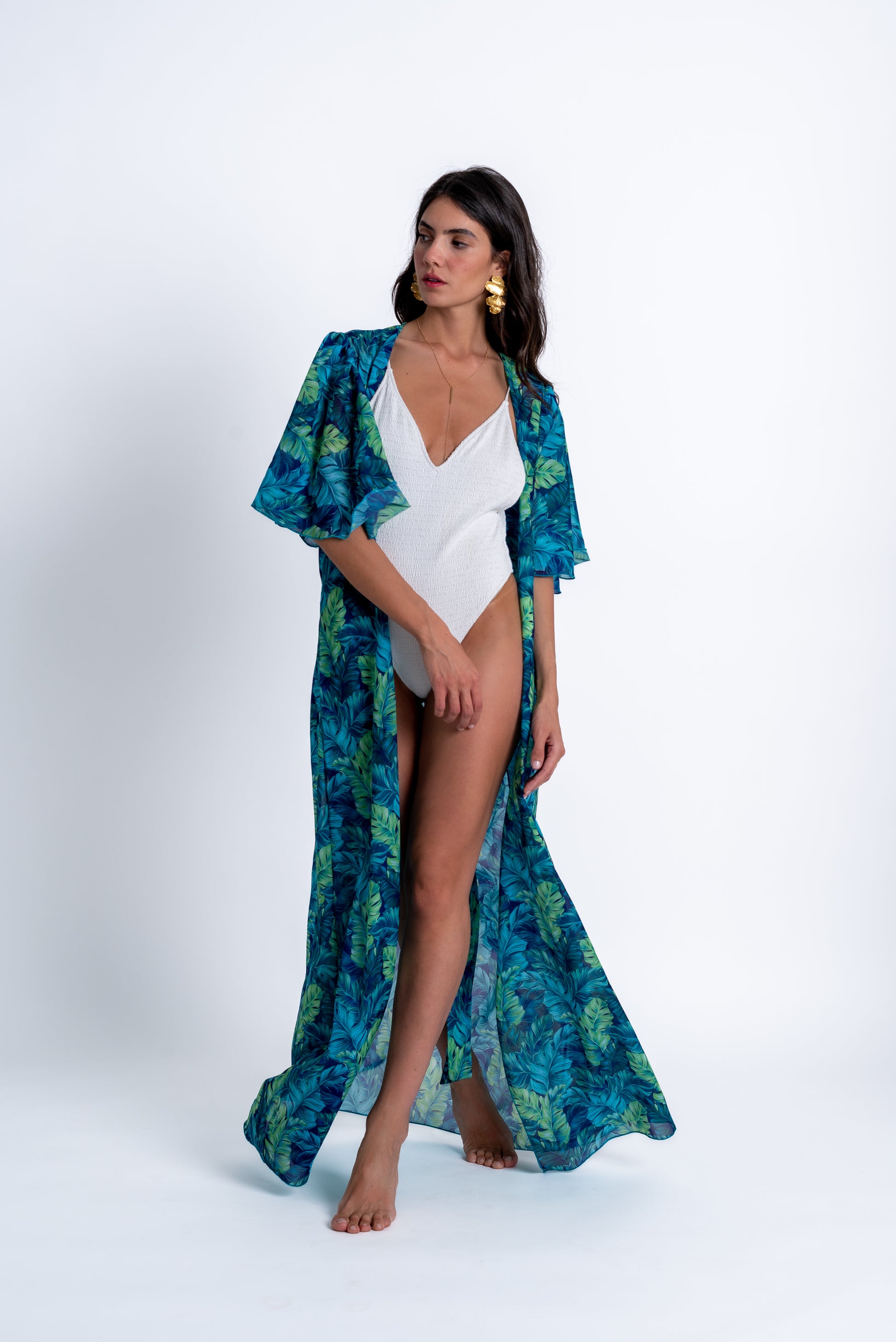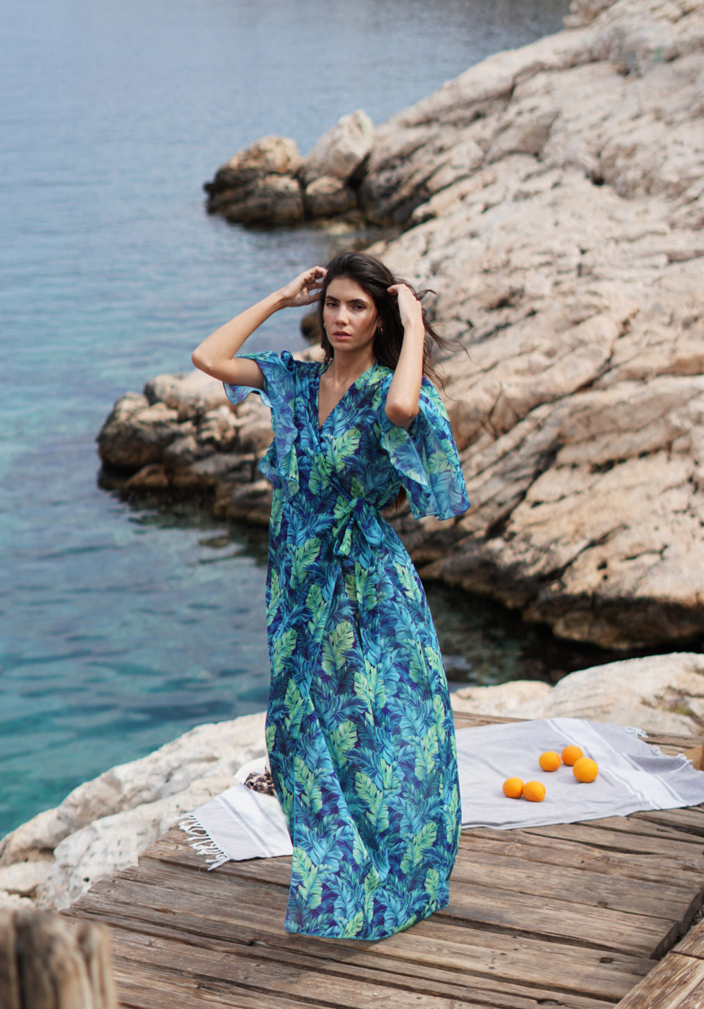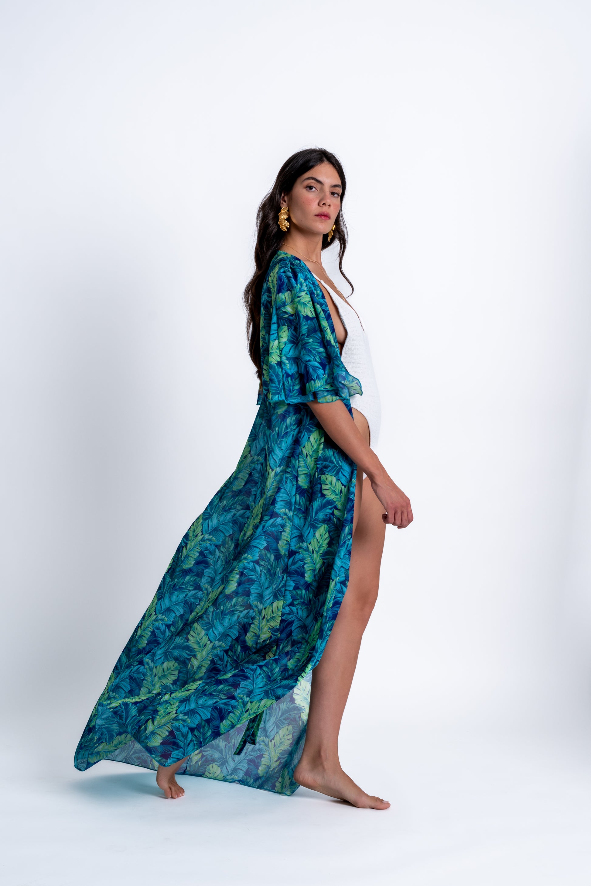 Maxi wrap kimono with integrated belt and ruffles on the sleeve