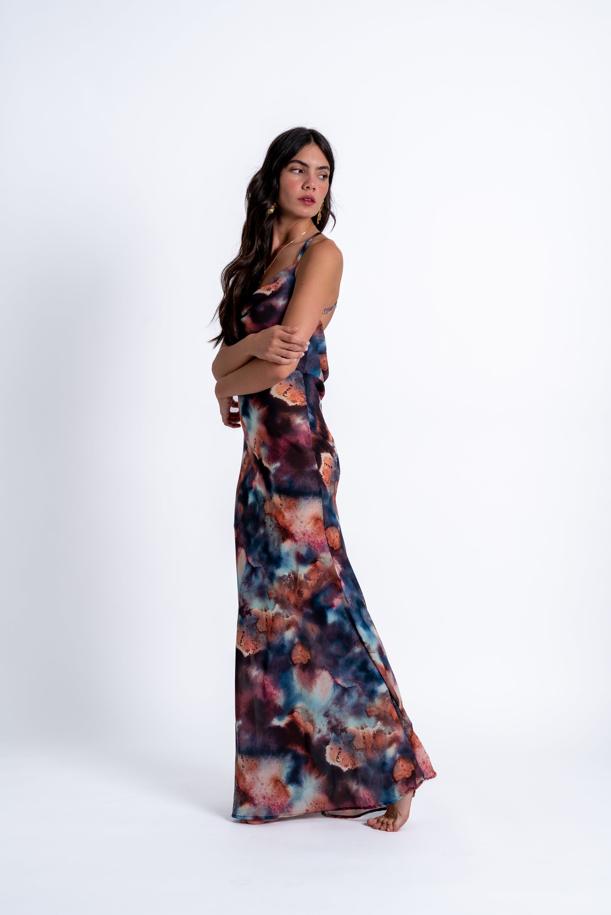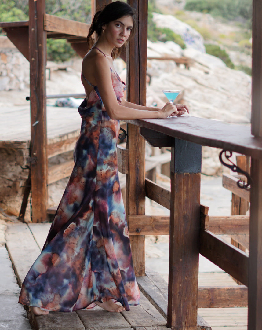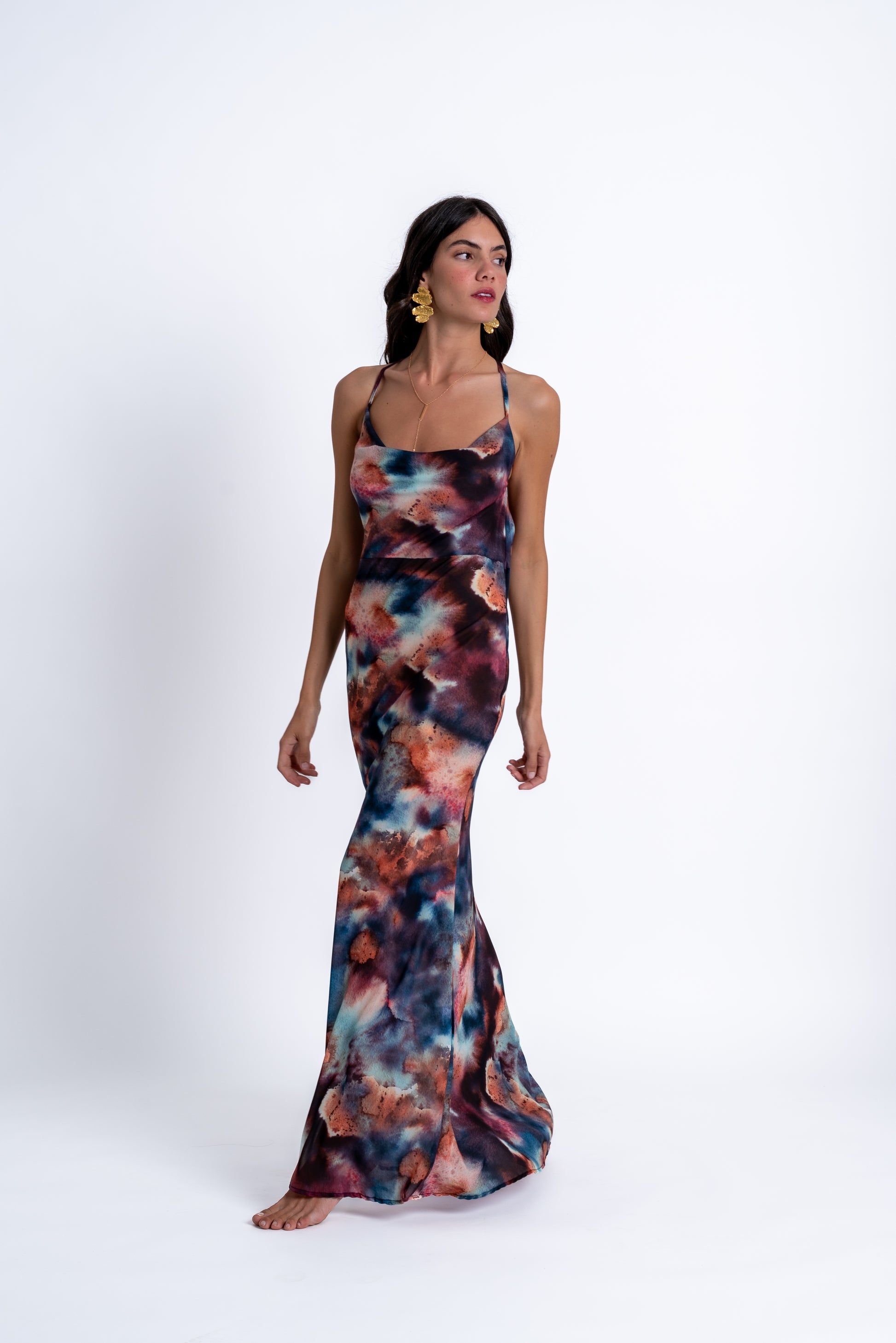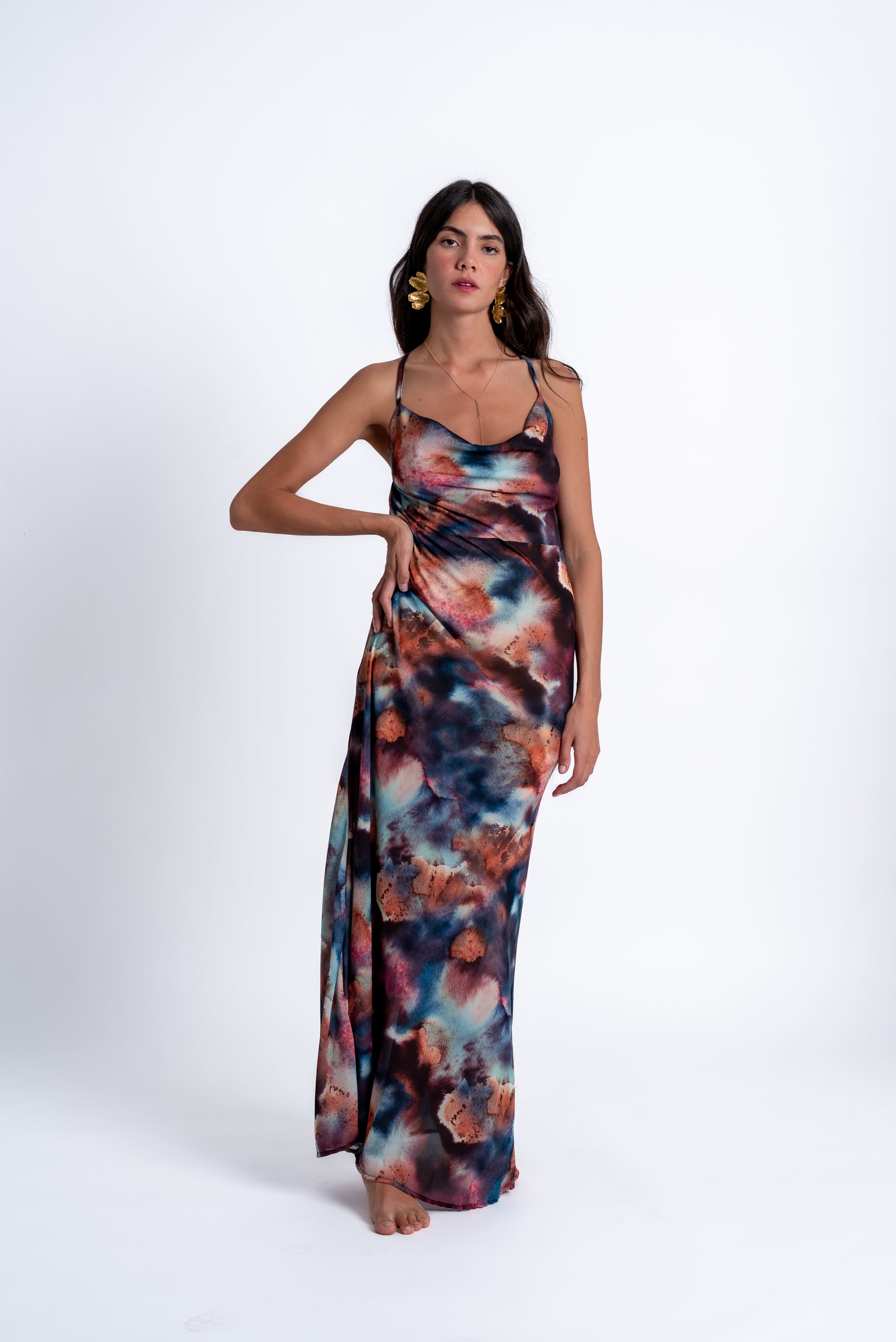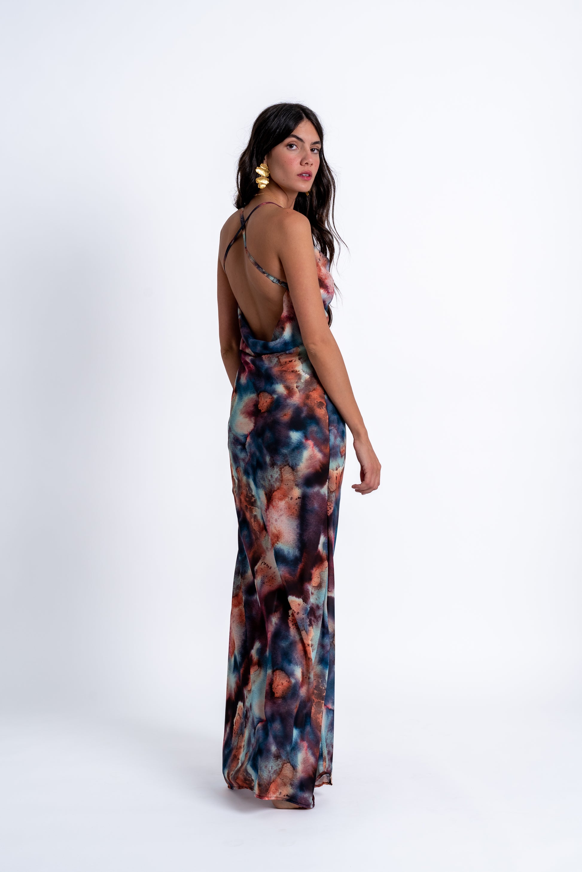 Semi sheer mermaid style dress , with cowl neck line, open back details and adjustable stripes